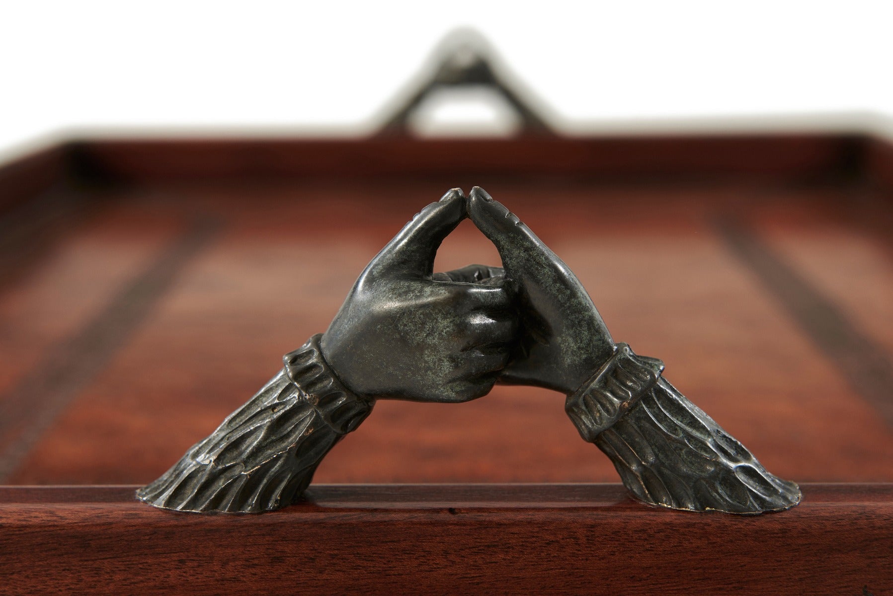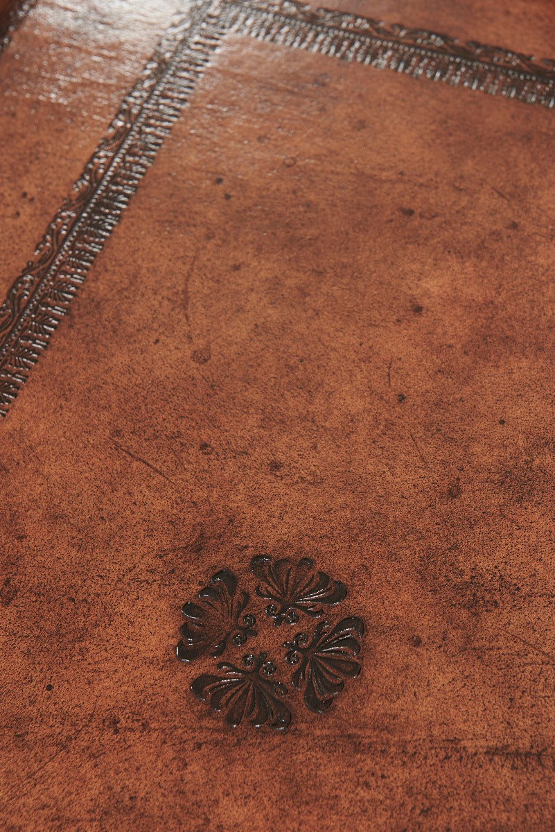 A brown tooled leather covered tray of rectangular shape with gallery and brass handles of clasping hands. The original Victorian.