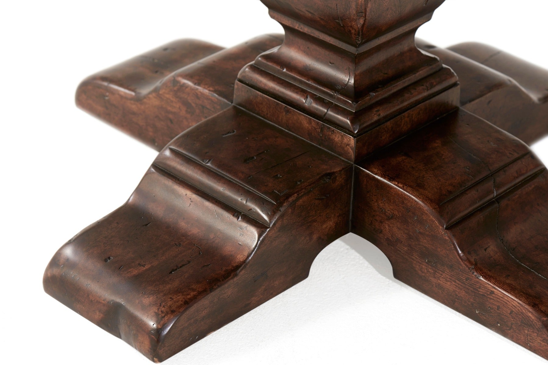A reclaimed oak and chestnut burl restored circular extending dining table, the segmented top opening to reveal six self storing fold out leaves above a plain frieze, on a vase column support and crossover refectory feet.