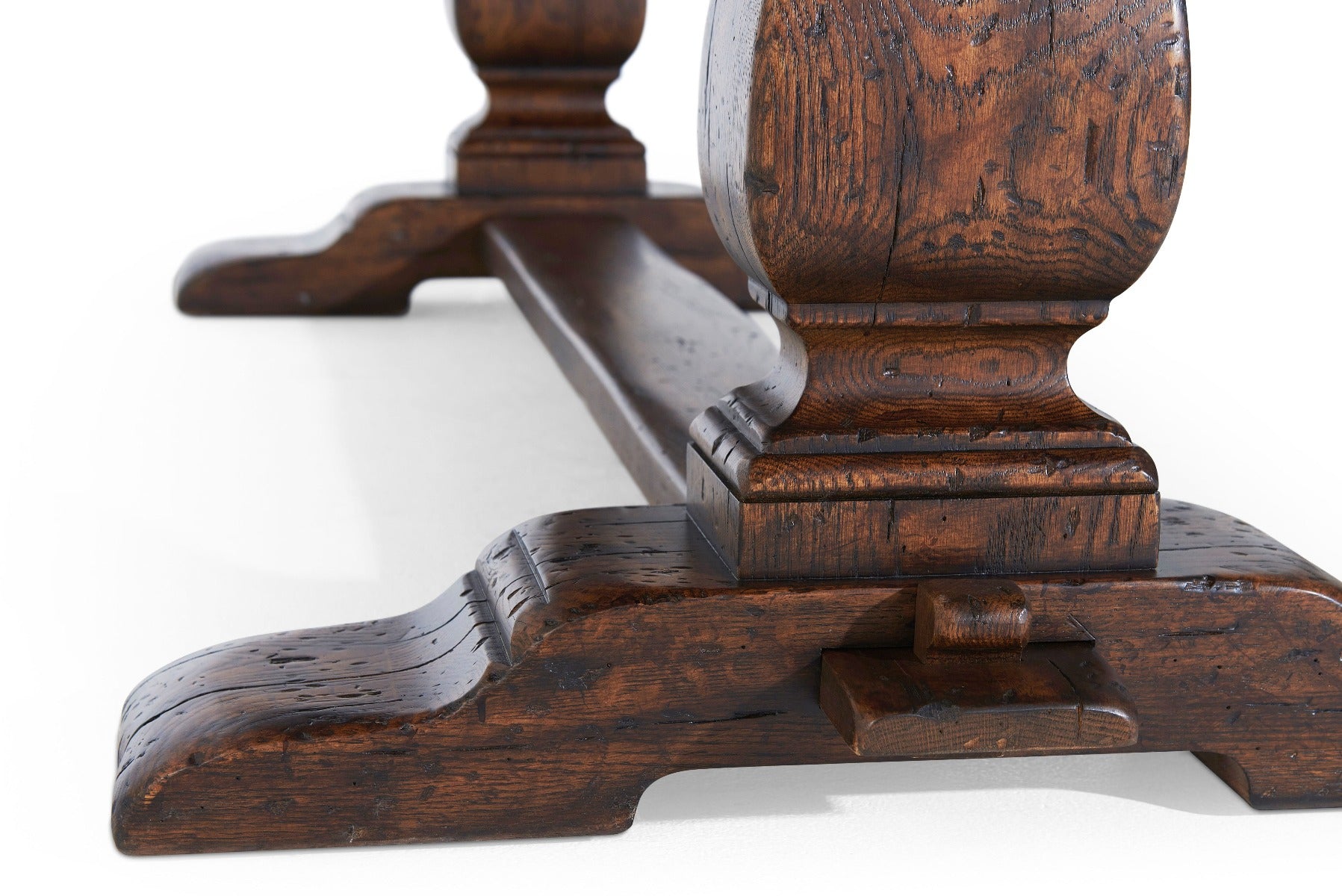 A reclaimed oak veneered refectory table, the planked rectangular moulded edge top above vase column supports and bases joined by a long stretcher. Inspired by a 17th century English original.